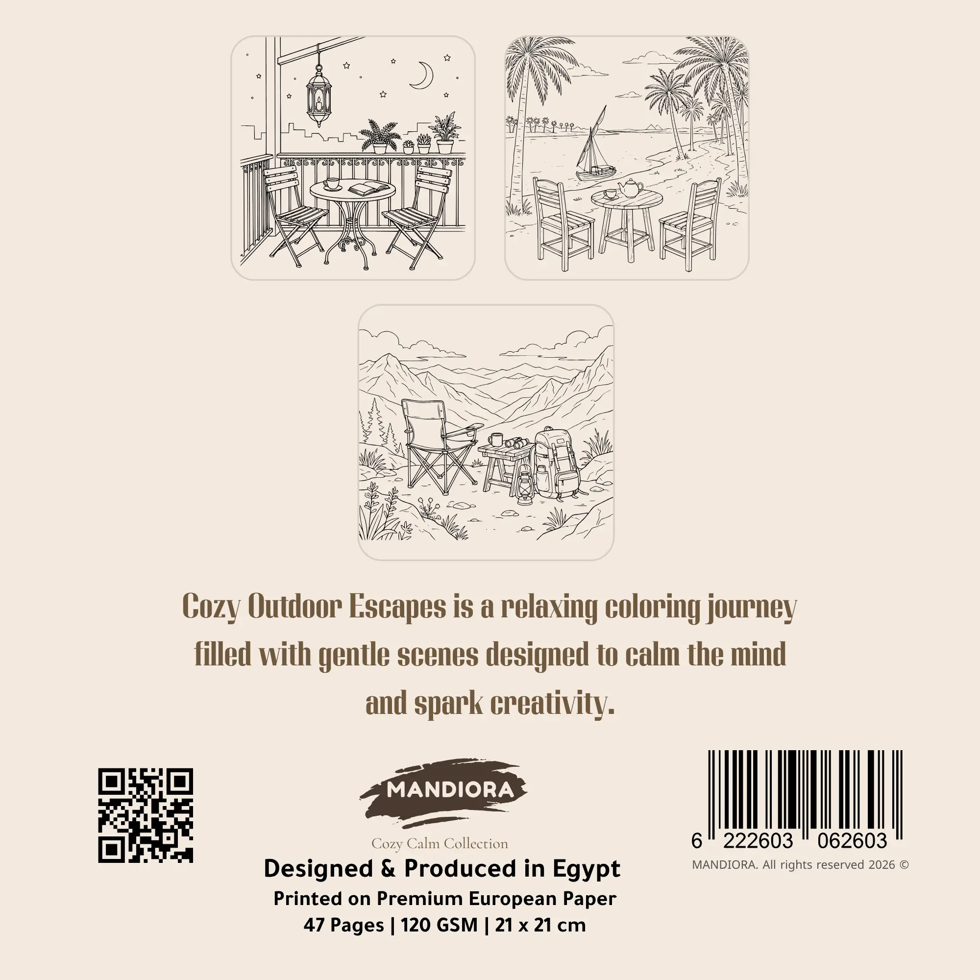 بنختار بعناية ورق برتغالي عالي الجودة، وبنقدّم كتب تلوين بصناعة مصرية وتصاميم أصلية مرسومة بالكامل من فريق Mandiora.