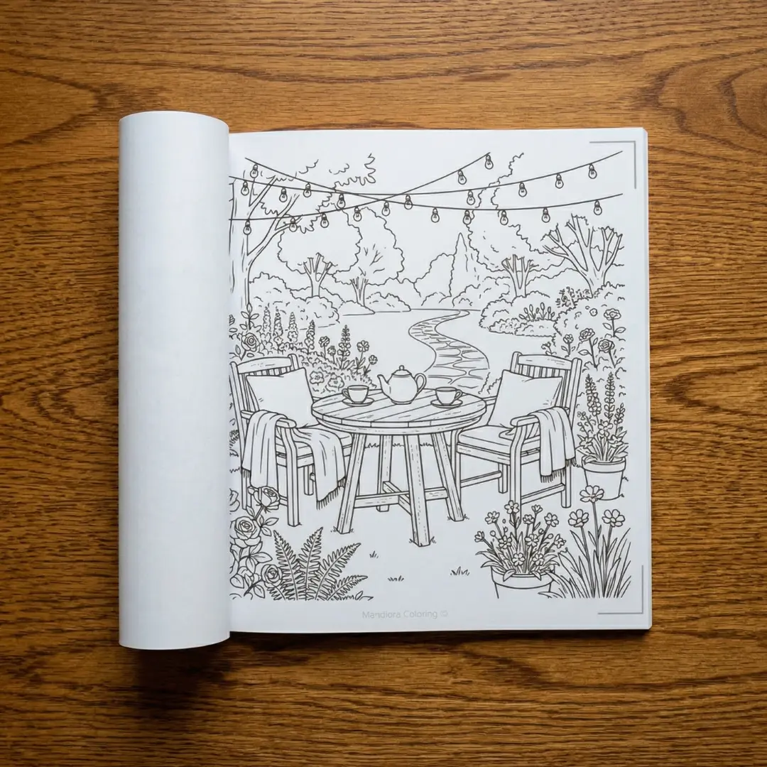 المحتوى: رسومات مريحة للعين تركز على تفاصيل الأماكن الخارجية الهادئة، تشمل الحدائق، المقاهي، والمساحات المفتوحة (Gardens, Cafés & Quiet Places).