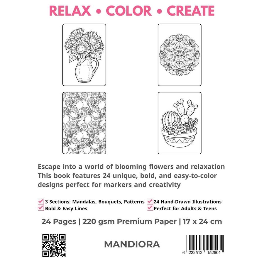 اكتشف متعة التلوين بدون قلق مع إصدارنا الجديد "Bloom & Relax". يتميز هذا الكتاب برسومات ماندالا بأسلوب "Bold & Easy" (خطوط عريضة وتفاصيل مريحة للعين)، مما يجعله مثالياً للاسترخاء الفوري دون تعقيد.
