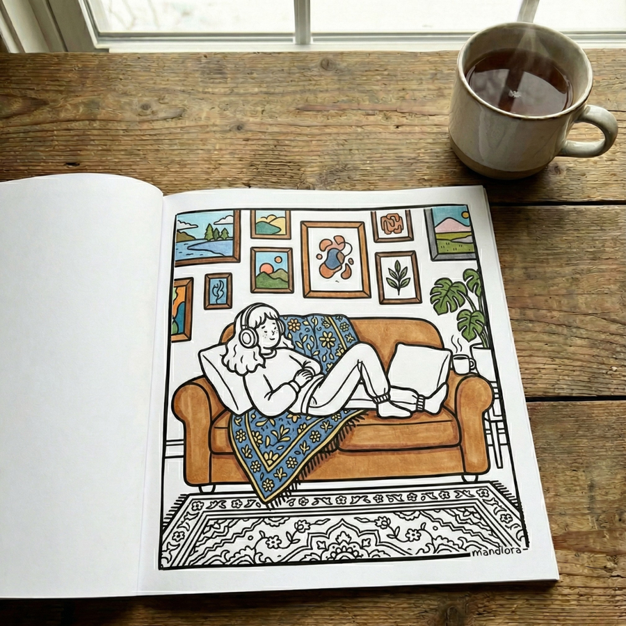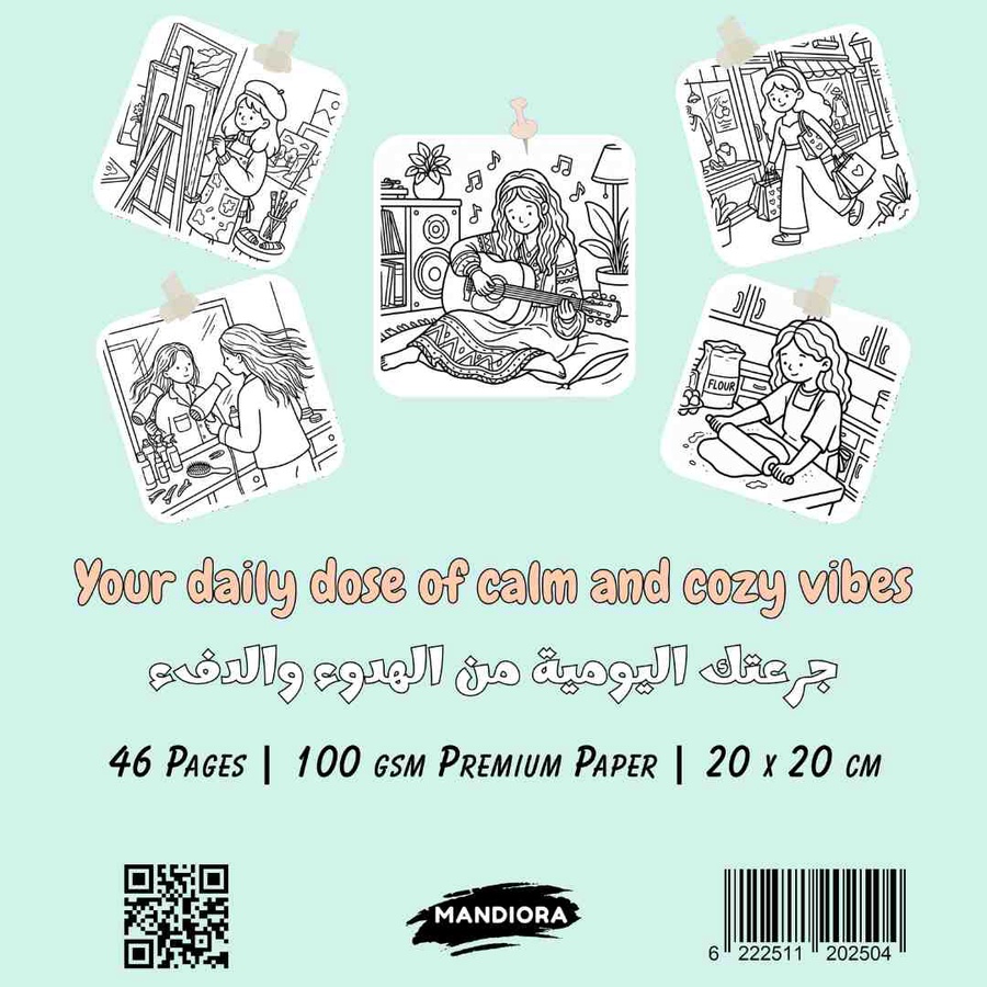 استمتع بمساحتك الخاصة من الهدوء والسكينة مع كل صفحة. صُمم هذا الكتاب ليكون رفيقك المثالي في أوقات الراحة، برسومات تجسد الدفء المنزلي وتفاصيل الحياة البسيطة لتساعدك على تصفية ذهنك بعيداً عن صخب اليوم.