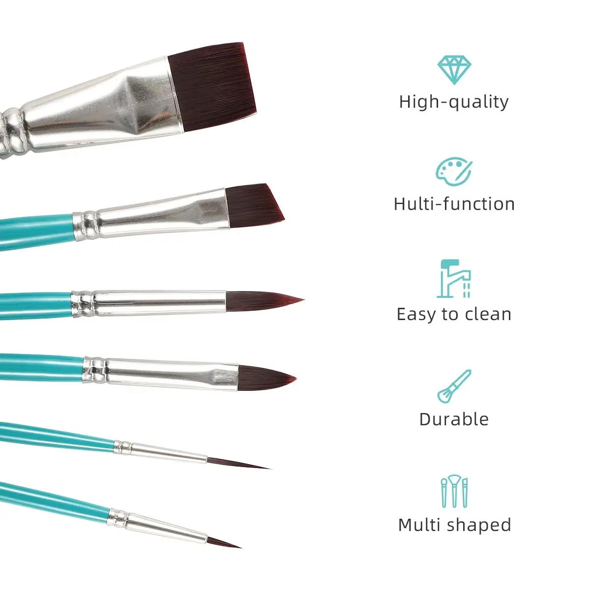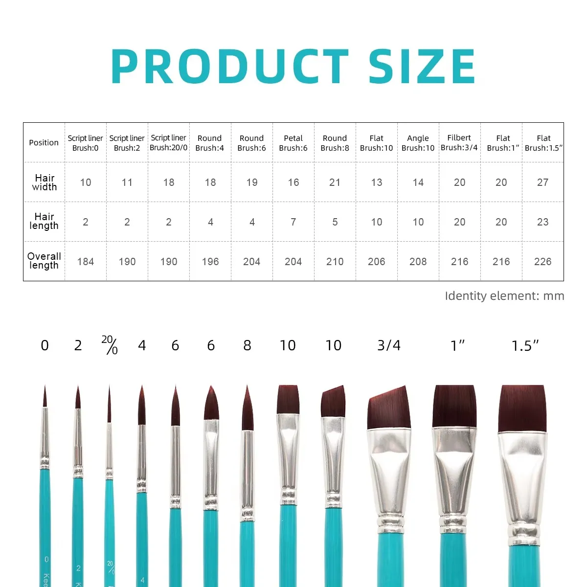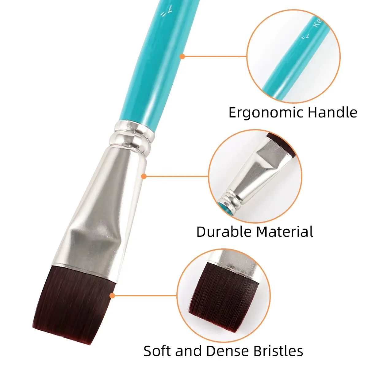 - شعيرات نايلون عالية الجودة: شعيرات صناعية ناعمة ومرنة، تحتفظ بشكلها جيداً ولا تتساقط أثناء الرسم.