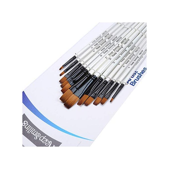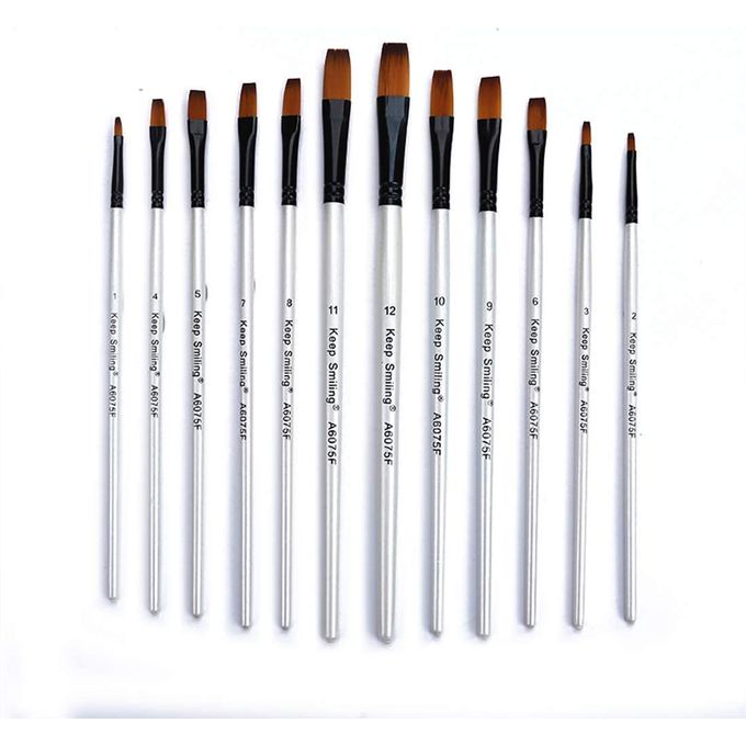 طقم فرش شامل يغطي كافة احتياجاتك الفنية من ماركة Keep Smiling. يحتوي الطقم على 12 فرشاة مسطحة (Flat) بأرقام متسلسلة من 1 إلى 12، مما يوفر لك التدرج المثالي في المقاسات لرسم المساحات الواسعة أو الحواف الحادة بدقة.