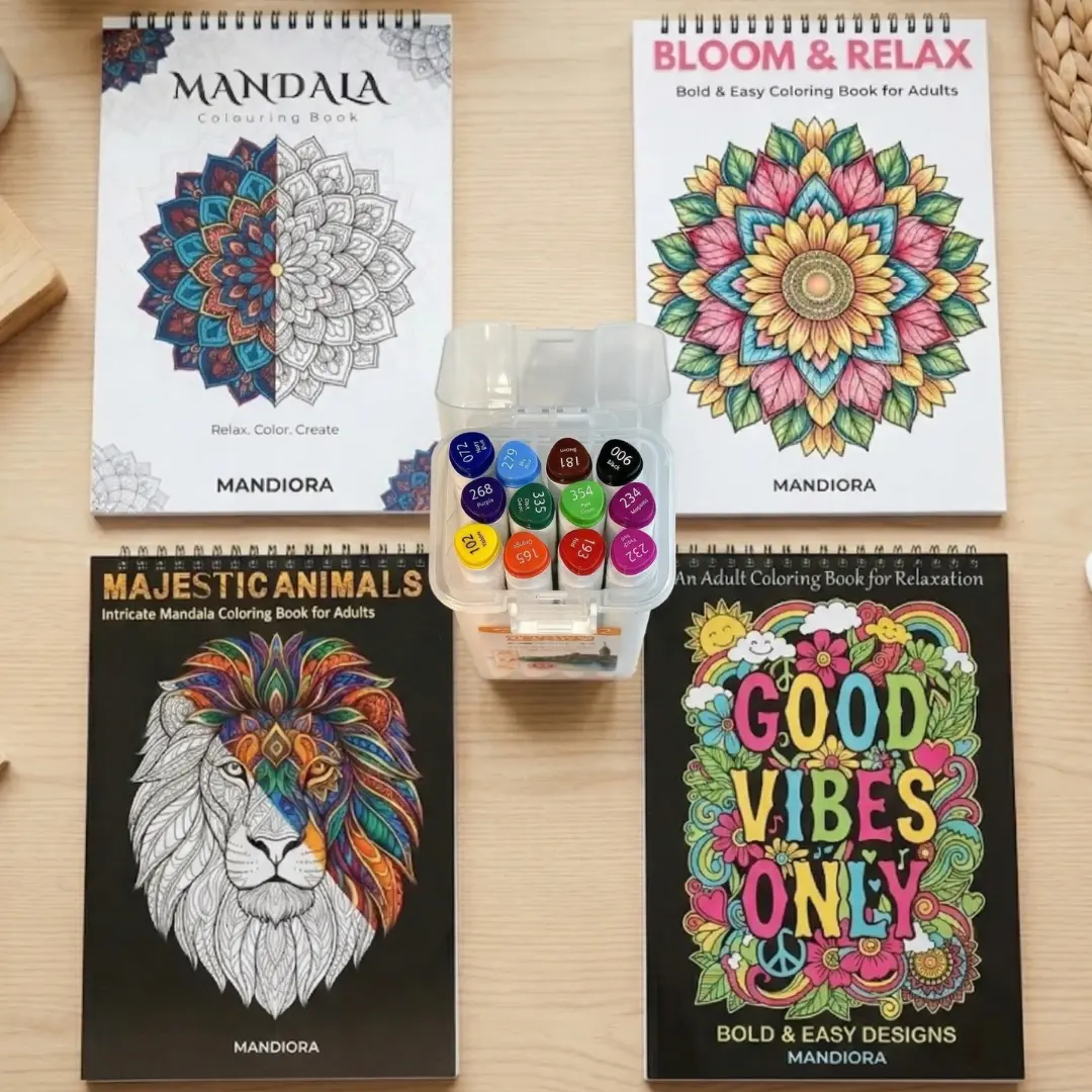 نصيحة من فريق مانديورا: هذه المجموعة مثالية للأمسيات الهادئة مع مشروبك الدافئ. ملمس الورق السميك مع انسيابية الماركر يخلق حالة من "التدفق" (Flow State) تنسيك أي توتر.
