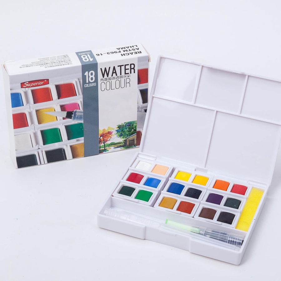 طقم ألوان مائية 18 لون من أكوريل سبريور يوفر لك تشكيلة متكاملة من الألوان الشفافة والنقية التي تمنحك حرية التعبير والابتكار في كل لوحة. تركيبة الألوان عالية الجودة تضمن تغطية ممتازة وثبات اللون مع لمسة ناعمة وسهلة الدمج. مثالي للرسم الفني، التلوين، وأعمال التصميم التي تحتاج لألوان مائية شفافة ومميزة. الطقم مناسب للمبتدئين والمحترفين على حد سواء، ويسهل حمله واستخدامه في أي مكان.